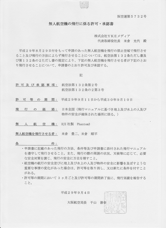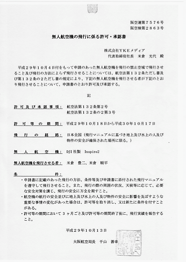 なお、国土交通省より日本全国1年間の包括許可を取得しています。
